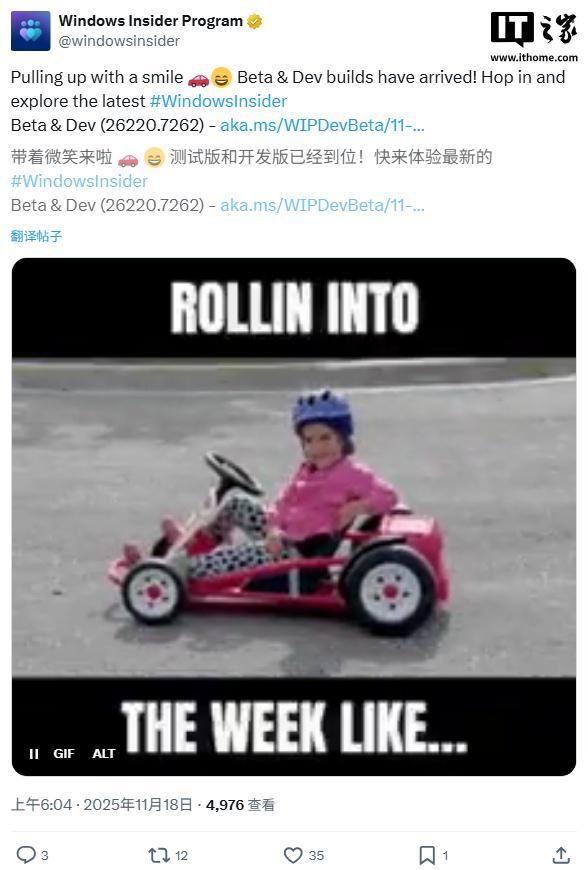 IT之家11月18日报道 当地时间周一,微软罕见地推出了新版Windows 11(25H2)BETA DEV预览版更新,版本号build 26220.7262(KB5070303)。微软提醒您,如果您是Dev频道的预览会员,可以借此机会切换到Beta频道。否则一旦版本号错开,可能还要再等一年这样的窗口期。当DEV版本号上来后,很可能会比现在不稳定,因此微软强烈建议你在迁移窗口打开时检查你想要加入哪个频道。此次更新带来了多项新功能和体验改进,包括旁白和放大镜的高分辨率语音、实验性开关代理功能、点击进行更新以及管理器相关问题的修复。在辅助功能方面,旁白和放大镜现在支持英语(美国)高清语音。这些新语音基于 Azure 最新版本采用文本转语音模型,利用生成式人工智能调整语调和节奏,使阅读更加自然。该功能的加入提高了长时间聆听时的舒适度,让阅读体验更加清晰流畅。但是,此语音类型目前仅提供英语(美国)版本。用户可以在设置中下载并切换不同的语音,并调整说话速度。画外音和放大镜都支持相同的激活过程。另外,旁白也增加了数学内容的可读性强。初期仅支持阅读Microsoft 365中的方程式(如word),并以更结构化的方式呈现数学表达式,以便视障用户更清晰地理解和探索相关内容。用户可以通过标准的Narrator阅读命令体验本次更新,微软表示未来预计会扩展到更多场景。还有一个实验性的“AI Agent”开关功能系统设置,位于系统→AI组件,可用于让系统使用最新的Windows Agent功能。微软还在测试新版本的点击设计来创建操作菜单,以更集中的方式显示复制、保存、共享和打开等常用的 Taps.ilian,以便快速使用。当屏幕上出现大图片或表格时,会自动弹出菜单,以便更快地进行相关操作。在图像对象选择方面,暂时关闭该功能;教学技巧和教程模式已更新,包括新的“开始教程”按钮和更清晰的说明。支持触觉反馈的手写笔在某些系统界面操作期间会遇到振动反馈,例如接近附近的按钮或调整窗口大小时。其他消息称,微软已重新配置 CFR 以支持 AI 操作,因此部分 Dev 和 Beta 通道用户可能无法看到临时图像。行动或f功能总结。另外,由于之前的功能没有按预期工作,因此还发布了以选项卡模式打开文件夹的更新。该版本还包含多项Bug修复,包括Winre和高级启动环境中部分用户键盘和鼠标失效的问题,以及关闭任务管理器后进程无法正确停止的问题。相关修复还解决了启动时意外弹出任务管理器的情况。设置中虚拟工作空间选项不起作用的问题也已修复,现在可以重复使用。微软列出了目前已知的问题,包括部分设备的开始菜单无法通过点击打开(注:但可以通过Windows键调用)、系统托盘不显示应用程序图标、深色模式下的复印对话框闪烁或显示异常等。此外,微软指出,ARM64 设备上的内部用户可能会遇到崩溃问题Visual Studio 或依赖 .NET Framework 的应用程序。安装最新的 .NET Framework 更新可能会解决此问题。参考文献: