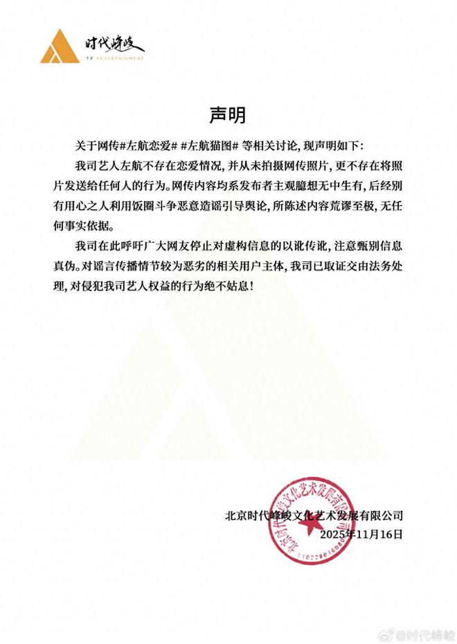 近日,网络上有报道称,#坐航爱情#引发热议。对此,@世峰君发表严正声明:针对#左航爱情##zuoHang猫图#以及网络上其他相关讨论,我们郑重声明如下:我司艺人左航没有恋爱关系,从未拍过照片进行网上传播,更没有将照片发送给任何人。在线发布的内容基于发布者的主观想象。后来,别有用心的人利用粉丝的斗争,恶意散布谣言,引导舆论。上述内容极其荒唐,毫无事实依据。我公司呼吁网友停止传播虚假信息,关注信息的真实性。阿明公司已针对散布谣言情节较严重的相关用户调取证据,并移交法务部门处理。我们绝不会容忍任何侵犯我们艺人权益的行为!潇湘晨报综合(来源:潇湘晨报综合)