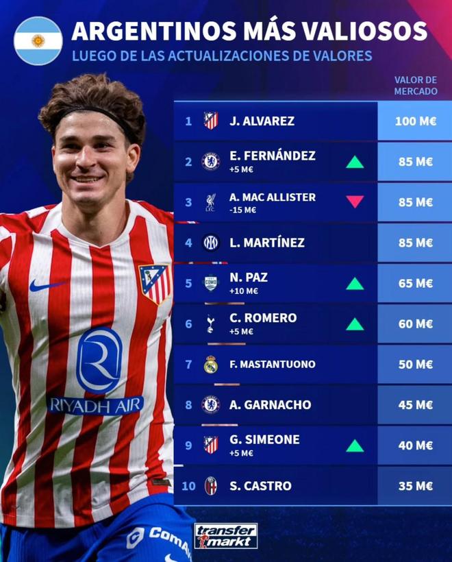 北京时间12月27日,德专列出了阿根廷最重要的10名球员。朱利安·阿尔瓦雷斯以1亿欧元的身价排名第一,恩佐·费尔南德斯、麦卡利斯特和劳塔罗以8500万欧元的身价位居第二。阿根廷球员身价前十名:1.朱利安·阿尔瓦雷斯(马德里竞技)1亿欧元2.恩佐·费尔南德斯(切尔西)8500万欧元3.麦卡利斯特(利物浦)8500万欧元4.劳塔罗(国际米兰)8500万欧元5.尼科·帕斯(科姆罗)6500万欧元热刺)6000万欧元7.马斯坦托诺(皇家马德里) 5000万欧元 8. 加纳乔(切尔西) 4500万欧元 9. 朱利亚诺·西蒙尼(马德里竞技) 4000万欧元 10. 圣地亚哥·卡斯特罗(博洛尼亚) 3500万欧元 【咪咕独家观看英超】